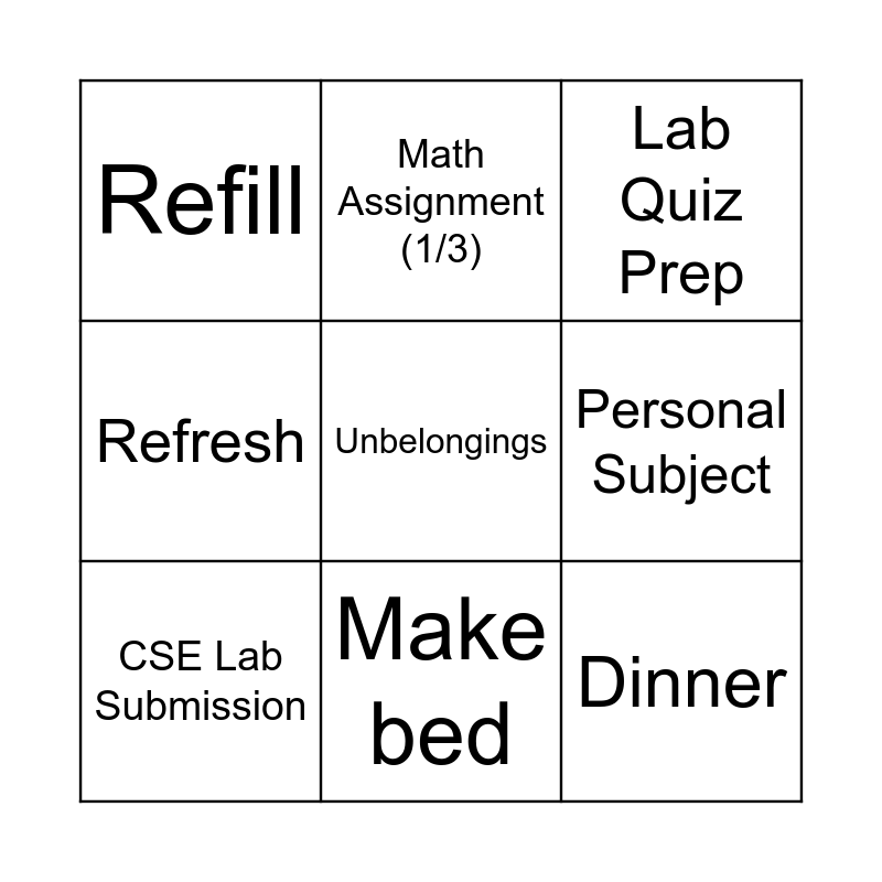 This bingo card has 9 words: CSE Lab Submission, Lab Quiz Prep, Math Assignment (1/3), Refresh, Refill, Personal Subject, Unbelongings, Dinner and Make bed.