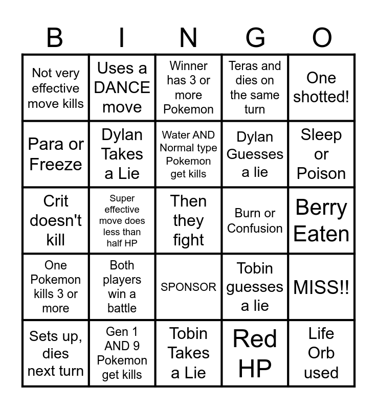 This bingo card has a free space and 24 words: Both players win a battle, Gen 1 AND 9 Pokemon get kills, Water AND Normal type Pokemon get kills, Sets up, dies next turn, One shotted!, Not very effective move kills, Para or Freeze, Uses a DANCE move, Burn or Confusion, SPONSOR, Dylan Guesses a lie, Crit doesn't kill, Tobin guesses a lie, MISS!!, Dylan Takes a Lie, Red HP, Berry Eaten, Winner has 3 or more Pokemon, Sleep or Poison, Super effective move does less than half HP, Life Orb used, One Pokemon kills 3 or more, Teras and dies on the same turn and Tobin Takes a Lie.