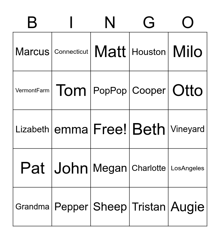 This bingo card has a free space and 29 words: Grandma, connor, emma, Bea, Marcus, Matt, Tom, John, Beth, Pepper, Vineyard, Augie, Sheep, Tristan, Otto, Pixie, Megan, Pat, Milo, Lizabeth, Charlotte, Duke, Cooper, VermontFarm, Houston, Connecticut, LosAngeles, PopPop and Syracuse.