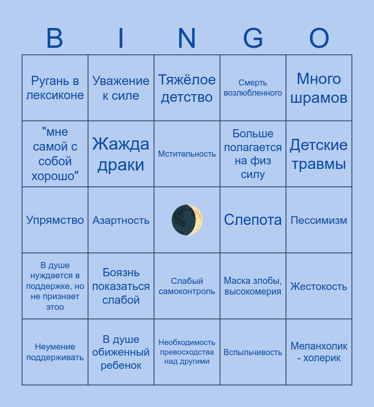 This bingo card has a free space and 24 words: Неумение поддерживать, Боязнь показаться слабой, Мстительность, Вспыльчивость, Много шрамов, Ругань в лексиконе, Уважение к силе, Тяжёлое детство, Слепота, Пессимизм, Упрямство, Жажда драки, Маска злобы, высокомерия, Жестокость, "мне самой с собой хорошо", В душе обиженный ребенок, Необходимость превосходства над другими, Смерть возлюбленного, Детские травмы, В душе нуждается в поддержке, но не признает этоо, Азартность, Слабый самоконтроль, Больше полагается на физ силу and Меланхолик - холерик.