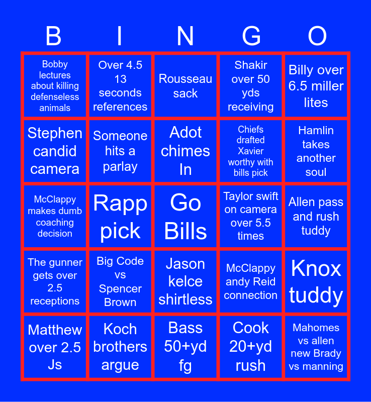 This bingo card has a free space and 24 words: Big Code vs Spencer Brown, Koch brothers argue, Adot chimes In, Matthew over 2.5 Js, Billy over 6.5 miller lites, Bobby lectures about killing defenseless animals, Stephen candid camera, Over 4.5 13 seconds references, Taylor swift on camera over 5.5 times, Jason kelce shirtless, Chiefs drafted Xavier worthy with bills pick, McClappy makes dumb coaching decision, McClappy andy Reid connection, Knox tuddy, Someone hits a parlay, Cook 20+yd rush, Allen pass and rush tuddy, Rousseau sack, Hamlin takes another soul, Rapp pick, Mahomes vs allen new Brady vs manning, The gunner gets over 2.5 receptions, Shakir over 50 yds receiving and Bass 50+yd fg.