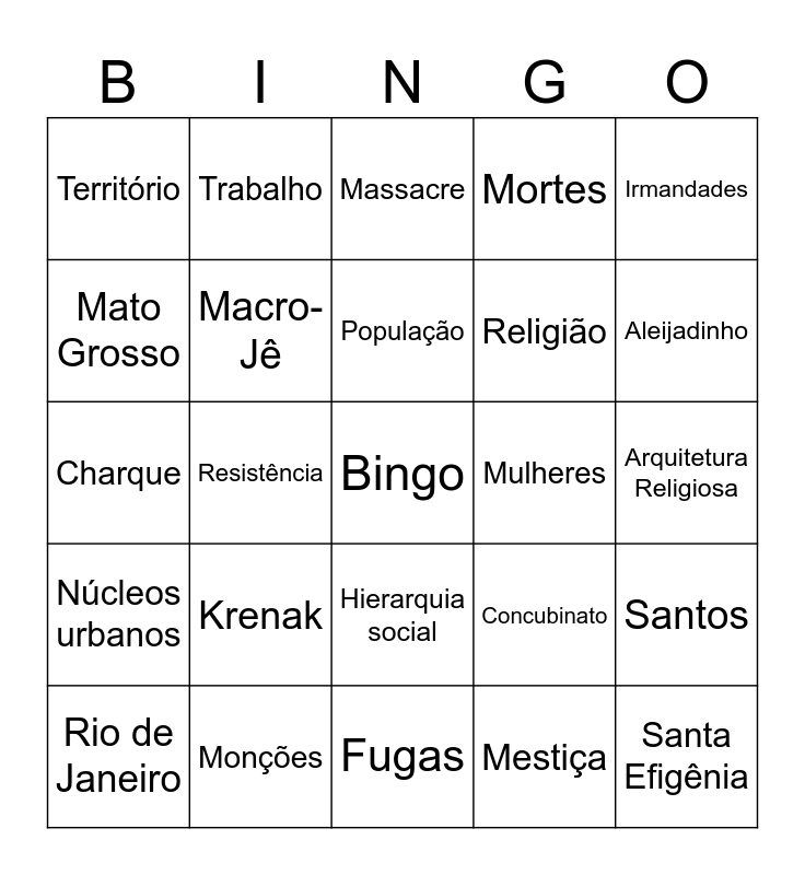 This bingo card has a free space and 25 words: Núcleos urbanos, Monções, Fugas, Mestiça, Irmandades, Território, Trabalho, Massacre, Mulheres, Santos, Mato Grosso, Macro-Jê, Epidemias, Concubinato, Aleijadinho, Rio de Janeiro, Resistência, População, Religião, Arquitetura Religiosa, Charque, Krenak, Hierarquia social, Mortes and Santa Efigênia.