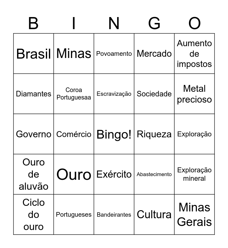 This bingo card has a free space and 25 words: Ouro, Bandeirantes, Escravização, Ciclo do ouro, Aumento de impostos, Brasil, Diamantes, Minas, Riqueza, Exército, Sociedade, Governo, Abastecimento, Exploração mineral, Coroa Portuguesaa, Ouro Preto, Exploração, Povoamento, Metal precioso, Comércio, Minas Gerais, Portugueses, Ouro de aluvão, Mercado and Cultura.
