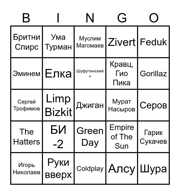 This bingo card has 60 words: Лолита, Руки вверх, Игорь Корнелюк, The Hatters, Алсу, Мумий Тролль, Елка, АNNA ASTI, Кравц, Гио Пика, Тимати, Zivert, Элвис Пресли, Эминем, Рианна, Мадонна, Бритни Спирс, Джиган, Feduk, Bon Jovi, Шуфутинский «, Мурат Насыров, Муслим Магомаев, Игорь Николаев, Гарик Сукачев, Доминик Джокер, Юрий Лоза, Amy Winehouse, Avril Lavigne, Gorillaz, Жуки, Леонтьев, Robbie Williams, Rammstein, Сосо Павлиашвили, Ума Турман, Maroon 5, Сплин, Limp Bizkit, Evanesence, Сергей Трофимов, Serebro, БИ -2, Серов, Пугачева, Empire of The Sun, Минаева, Татьяна Куртукова, 50 cent, Nickelback, Green Day, Coldplay, Paramore, Simple Plan, Blue October, bearwolf, Lumen, Stigmata, Каста, Шура and Imagine dragon’.