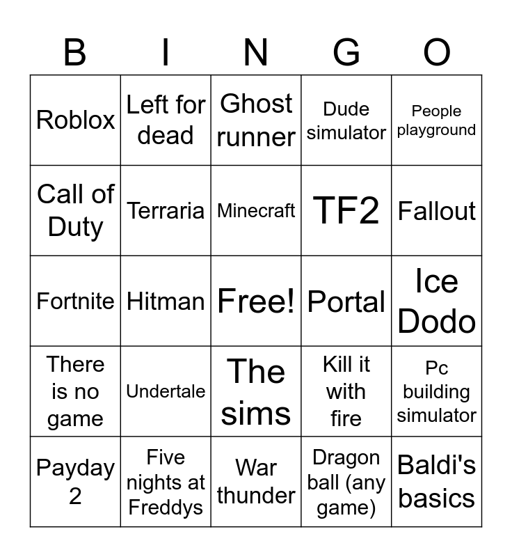 This bingo card has a free space and 24 words: Undertale, Five nights at Freddys, Minecraft, Payday 2, People playground, Roblox, Call of Duty, Left for dead, Portal, The sims, TF2, Fortnite, Kill it with fire, Pc building simulator, Terraria, Dragon ball (any game), Ice Dodo, Ghost runner, Fallout, Hitman, Baldi's basics, There is no game, Dude simulator and War thunder.
