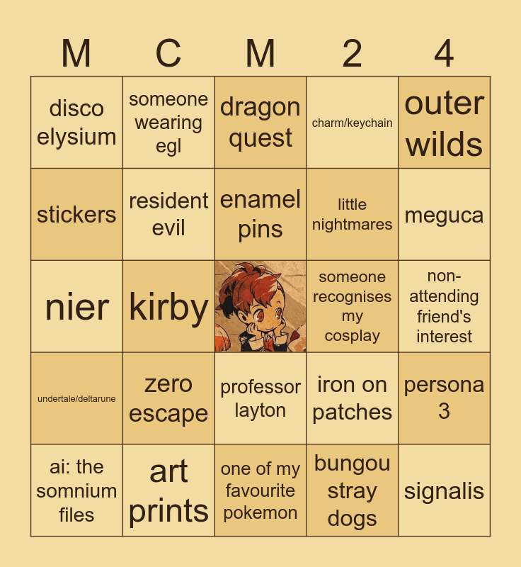 This bingo card has a free space and 24 words: zero escape, art prints, enamel pins, ai: the somnium files, outer wilds, disco elysium, stickers, someone wearing egl, someone recognises my cosplay, professor layton, little nightmares, nier, iron on patches, persona 3, resident evil, bungou stray dogs, non-attending friend's interest, dragon quest, meguca, kirby, signalis, undertale/deltarune, charm/keychain and one of my favourite pokemon.
