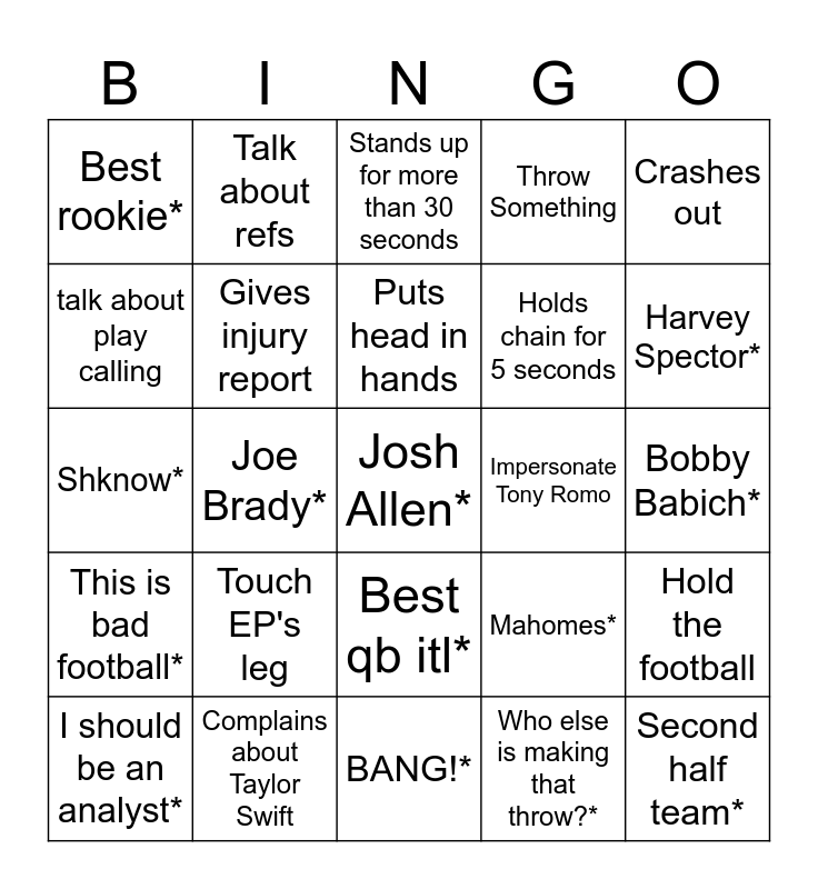 This bingo card has a free space and 24 words: Touch EP's leg, Complains about Taylor Swift, Puts head in hands, I should be an analyst*, Crashes out, Best rookie*, talk about play calling, Talk about refs, Impersonate Tony Romo, Best qb itl*, Holds chain for 5 seconds, Shknow*, Mahomes*, Hold the football, Gives injury report, Who else is making that throw?*, Bobby Babich*, Stands up for more than 30 seconds, Harvey Spector*, Joe Brady*, Second half team*, This is bad football*, Throw Something and BANG!*.