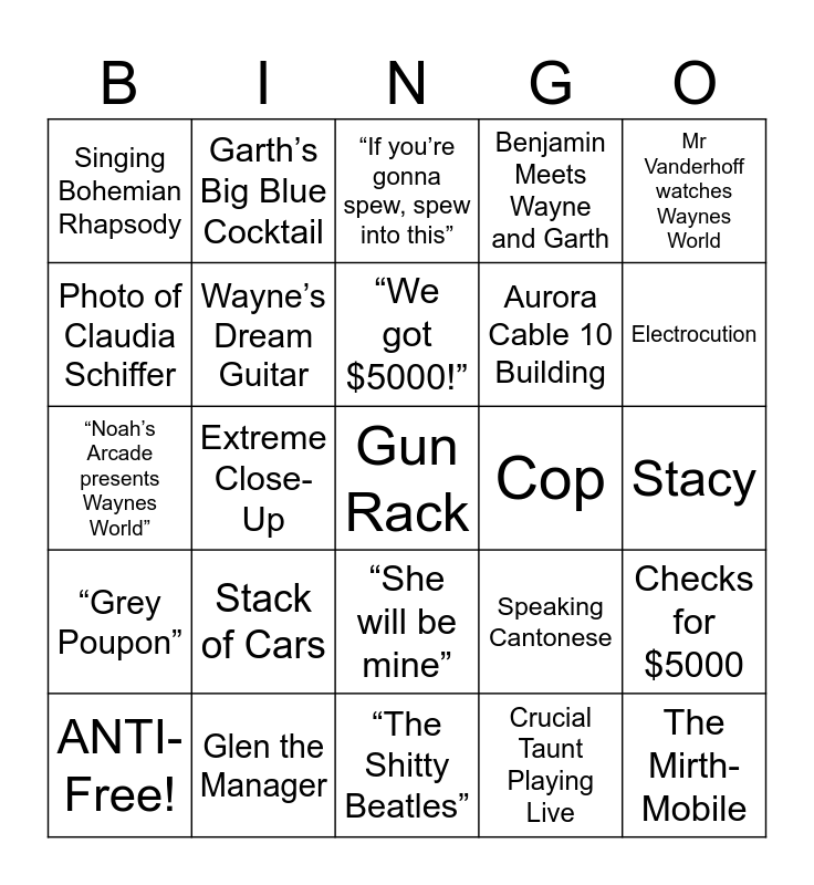 This bingo card has 29 words: ANTI-Free!, “Waynes’s World”, Extreme Close-Up, The Mirth-Mobile, Singing Bohemian Rhapsody, “If you’re gonna spew, spew into this”, Wayne’s Dream Guitar, Stack of Cars, Cop, Glen the Manager, Stacy, Gun Rack, “The Shitty Beatles”, Crucial Taunt Playing Live, Electrocution, “Schwing”, “She will be mine”, “Grey Poupon”, Mr Vanderhoff watches Waynes World, “Noah’s Arcade presents Waynes World”, Speaking Cantonese, Scratching a Car, Aurora Cable 10 Building, Photo of Claudia Schiffer, Benjamin Meets Wayne and Garth, Garth’s Big Blue Cocktail, Checks for $5000, “We got $5000!” and “I love you, man”.