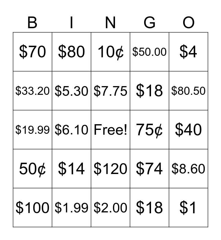 This bingo card has a free space and 24 words: $14, $1.99, $7.75, $100, $4, $70, $33.20, $80, 75¢, $120, $18, $19.99, $74, $8.60, $5.30, $18, $40, 10¢, $80.50, $6.10, $1, 50¢, $50.00 and $2.00.