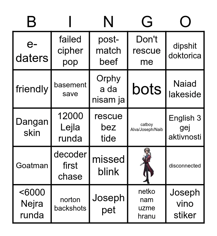 This bingo card has 1 images, a free space and 23 words: decoder first chase, norton backshots, Orphy a da nisam ja, <6000 Nejra runda, dipshit doktorica, e-daters, friendly, failed cipher pop, catboy Alva/Joseph/Naib, missed blink, bots, Dangan skin, disconnected, basement save, netko nam uzme hranu, English 3 gej aktivnosti, post-match beef, Naiad lakeside, 12000 Lejla runda, Joseph vino stiker, Goatman, Don't rescue me and Joseph pet.