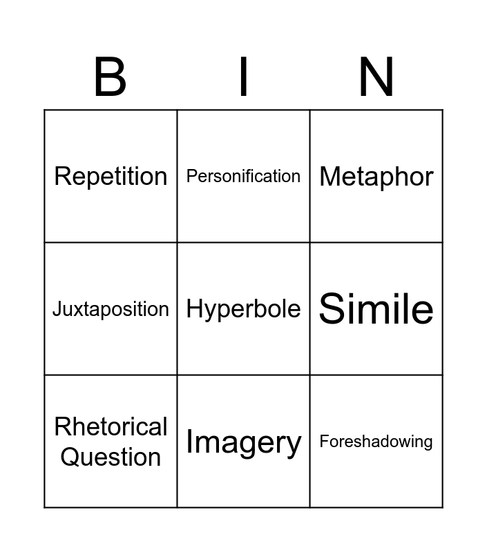 This bingo card has a free space and 8 words: Simile, Metaphor, Personification, Rhetorical Question, Repetition, Foreshadowing, Juxtaposition and Imagery.