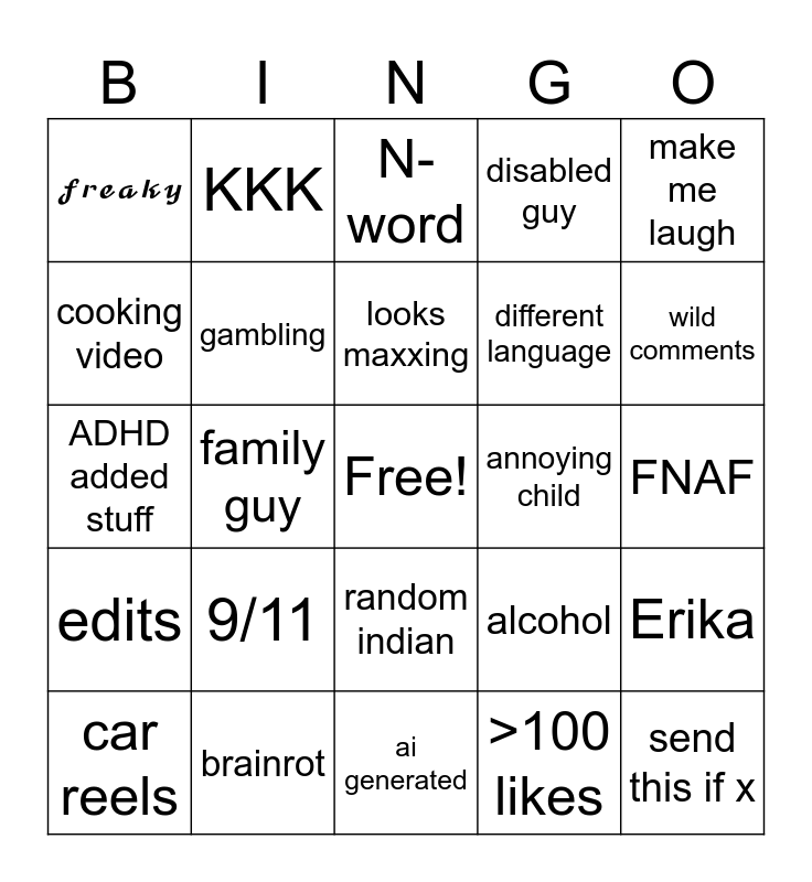 This bingo card has a free space and 29 words: car reels, death, family guy, reddit story, ๐ฏ๐ป๐ฎ๐ช๐ด๐, N-word, gambling, 9/11, annoying child, brainrot, FNAF, send this if x, ai generated, >100 likes, wild comments, sea memes, random indian, edits, make me laugh, ADHD added stuff, alcohol, politics, different language, cooking video, disabled guy, KKK, Erika, looks maxxing and gameplay footage.