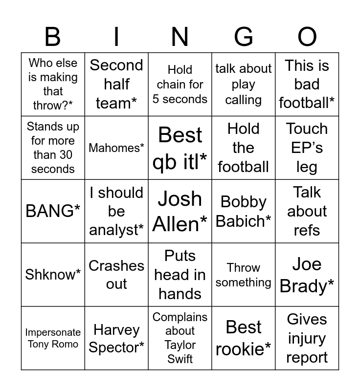 This bingo card has a free space and 24 words: Crashes out, Harvey Spector*, Best qb itl*, Impersonate Tony Romo, This is bad football*, Who else is making that throw?*, Stands up for more than 30 seconds, Second half team*, Bobby Babich*, Puts head in hands, Hold the football, BANG*, Throw something, Joe Brady*, Mahomes*, Best rookie*, Talk about refs, Hold chain for 5 seconds, Touch EP’s leg, I should be analyst*, Gives injury report, Shknow*, talk about play calling and Complains about Taylor Swift.