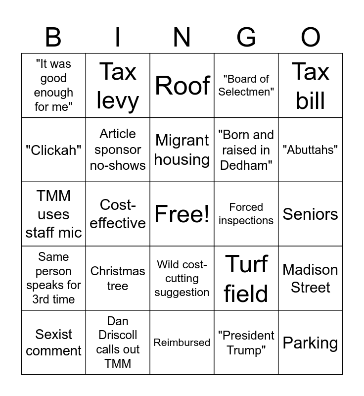 This bingo card has a free space and 42 words: Hotel, Migrant housing, Democracy, Christmas tree, "President Trump", Madison Street, Parking, Veterans, Roof, Wild cost-cutting suggestion, Seniors, "Abuttahs", Cost-effective, Tax bill, Fixed income, Turf field, Constituents, TMM uses staff mic, "Free cash", Tax levy, "Clickah", Solar panelts, Neighborhood schools, "It was good enough for me", Old maurauder logo, Article no longer supported by sponsors, "Born and raised in Dedham", Out-of-control spending, "Move the question", Someone onstage yawns, "The ahticle", Same person speaks for 3rd time, Article sponsor no-shows, Reimbursed, Racist comment, Sexist comment, Dan Driscoll calls out TMM, Forced inspections, Storm water, Someone speaks w/o mic, "Board of Selectmen" and TMM collective groan.