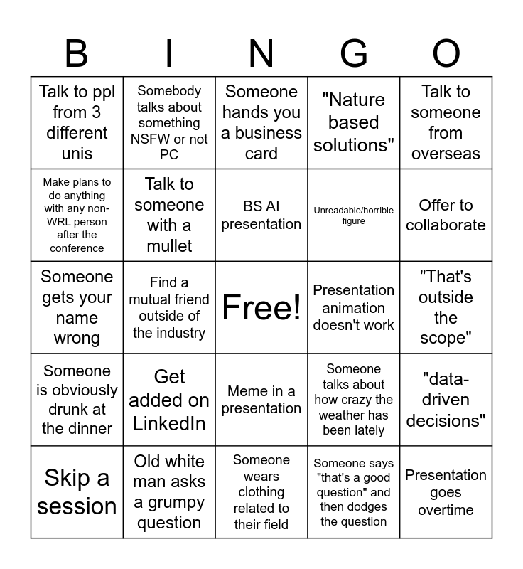 This bingo card has a free space and 24 words: Get added on LinkedIn, Old white man asks a grumpy question, BS AI presentation, Skip a session, Talk to someone from overseas, Talk to ppl from 3 different unis, Make plans to do anything with any non-WRL person after the conference, Somebody talks about something NSFW or not PC, Presentation animation doesn't work, Meme in a presentation, Unreadable/horrible figure, Someone gets your name wrong, Someone talks about how crazy the weather has been lately, "data-driven decisions", Talk to someone with a mullet, Someone says "that's a good question" and then dodges the question, "That's outside the scope", Someone hands you a business card, Offer to collaborate, Find a mutual friend outside of the industry, Presentation goes overtime, Someone is obviously drunk at the dinner, "Nature based solutions" and Someone wears clothing related to their field.