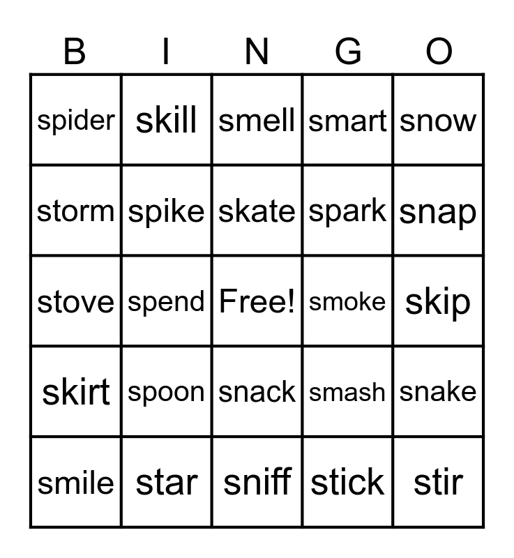 This bingo card has a free space and 24 words: spoon, star, skate, smile, snow, spider, storm, skill, smoke, snack, spark, stove, smash, snake, spike, stick, skip, smell, snap, spend, stir, skirt, smart and sniff.