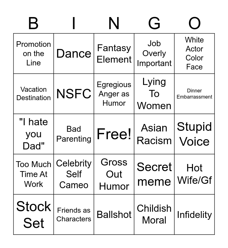 This bingo card has a free space and 24 words: Celebrity Self Cameo, Friends as Characters, Egregious Anger as Humor, Stock Set, White Actor Color Face, Promotion on the Line, Vacation Destination, Dance, Asian Racism, Gross Out Humor, Lying To Women, "I hate you Dad", Secret meme, Hot Wife/Gf, NSFC, Childish Moral, Stupid Voice, Fantasy Element, Dinner Embarrassment, Bad Parenting, Infidelity, Too Much Time At Work, Job Overly Important and Ballshot.