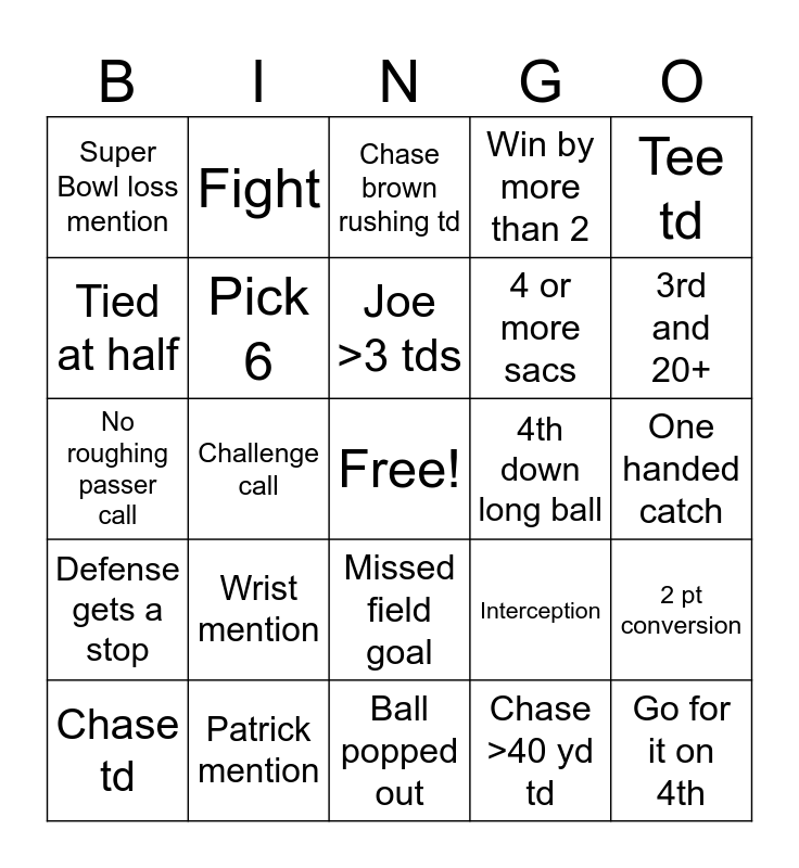 This bingo card has a free space and 24 words: Wrist mention, Patrick mention, Joe >3 tds, Chase td, Tee td, Super Bowl loss mention, Tied at half, Fight, 4th down long ball, Missed field goal, 4 or more sacs, No roughing passer call, Interception, 2 pt conversion, Pick 6, Chase >40 yd td, One handed catch, Chase brown rushing td, 3rd and 20+, Challenge call, Go for it on 4th, Defense gets a stop, Win by more than 2 and Ball popped out.