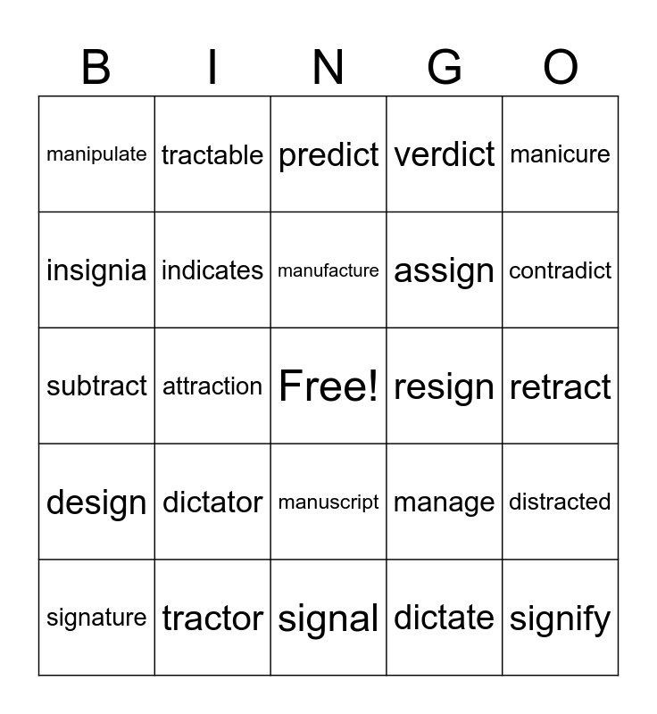 This bingo card has a free space and 24 words: dictator, tractor, manufacture, signature, manicure, manipulate, insignia, tractable, resign, manuscript, assign, subtract, manage, distracted, indicates, dictate, retract, predict, contradict, attraction, signify, design, verdict and signal.