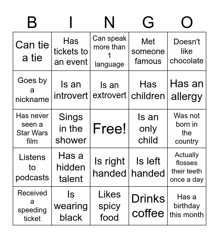 This bingo card has a free space and 27 words: Is left handed, Owns a pet other than a cat or dog, Has children, Likes spicy food, Goes by a nickname, Can speak more than 1 language, Has tickets to an event, Listens to podcasts, Is an only child, Actually flosses their teeth once a day, Has never seen a Star Wars film, Met someone famous, Received a speeding ticket, Is wearing black, Has an allergy, Has been a pen pal, Is an introvert, Is an extrovert, Has a hidden talent, Can tie a tie, Was not born in the country, Drinks coffee, Sings in the shower, Has a birthday this month, Is right handed, Doesn't like chocolate and Has older siblings.