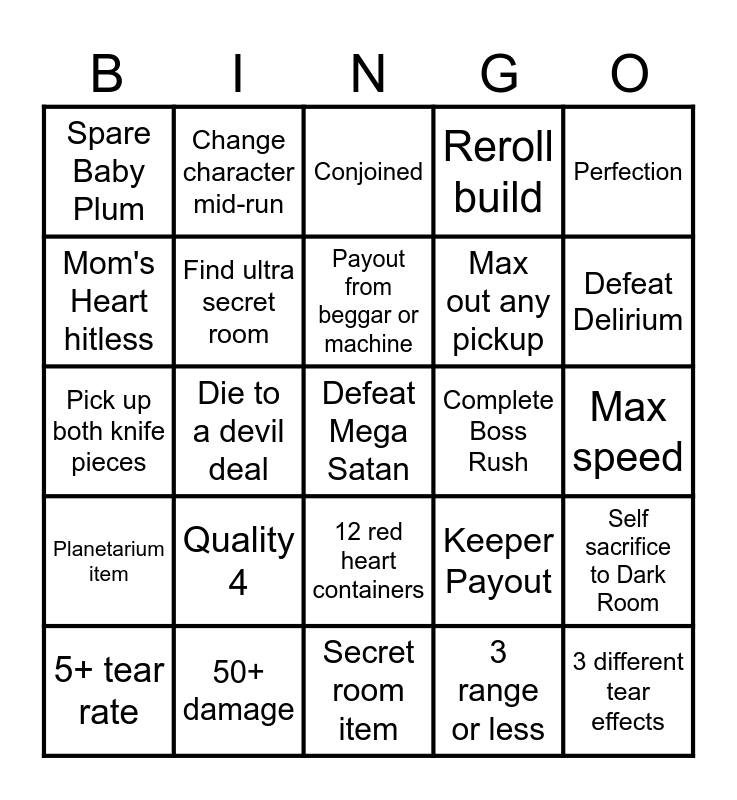 This bingo card has 25 words: Quality 4, Secret room item, Payout from beggar or machine, 5+ tear rate, Perfection, Spare Baby Plum, Mom's Heart hitless, Change character mid-run, Complete Boss Rush, 12 red heart containers, Max out any pickup, Pick up both knife pieces, Keeper Payout, Self sacrifice to Dark Room, Find ultra secret room, 3 different tear effects, Max speed, Conjoined, Defeat Delirium, Die to a devil deal, Defeat Mega Satan, 50+ damage, Planetarium item, Reroll build and 3 range or less.