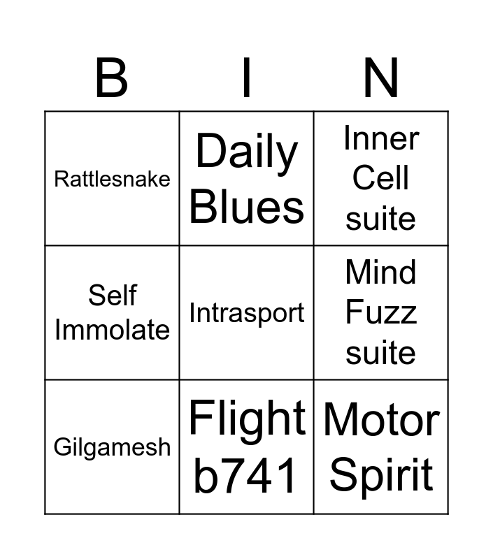 This bingo card has a free space and 8 words: Mind Fuzz suite, Inner Cell suite, Daily Blues, Gilgamesh, Rattlesnake, Motor Spirit, Self Immolate and Flight b741.