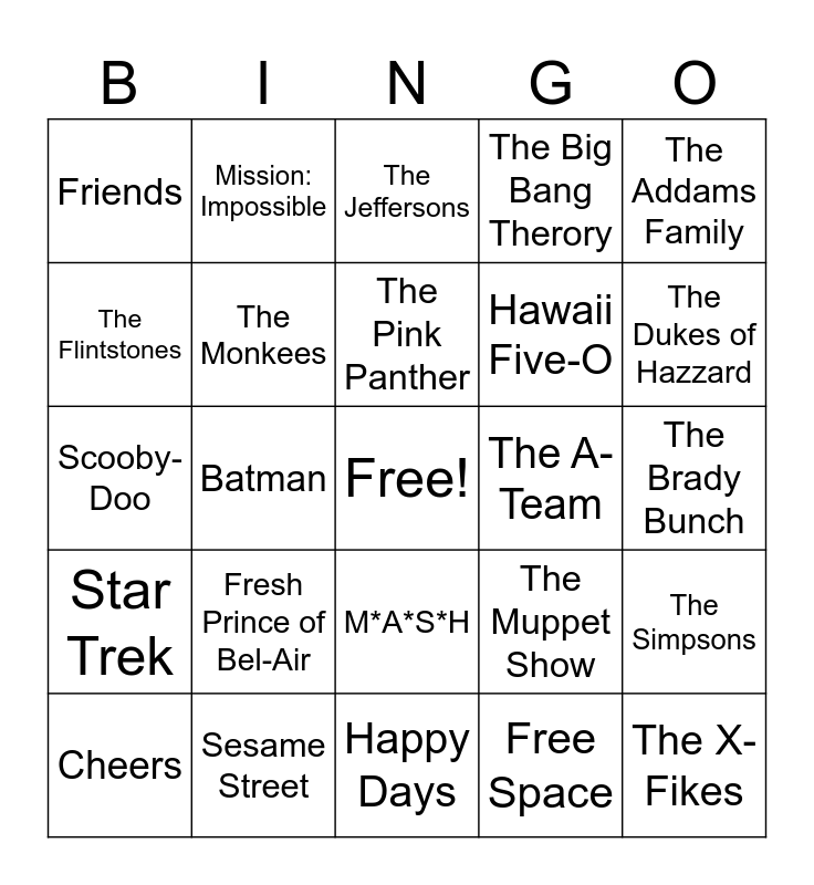 This bingo card has a free space and 25 words: Fresh Prince of Bel-Air, Happy Days, The Pink Panther, Cheers, The Addams Family, Friends, The Flintstones, Mission: Impossible, The A-Team, M*A*S*H, Hawaii Five-O, Scooby-Doo, The Muppet Show, The Simpsons, The Monkees, The Beverly Hillbillies, The Brady Bunch, The Jeffersons, The Dukes of Hazzard, Batman, The X-Fikes, Sesame Street, Star Trek, The Big Bang Therory and Free Space.