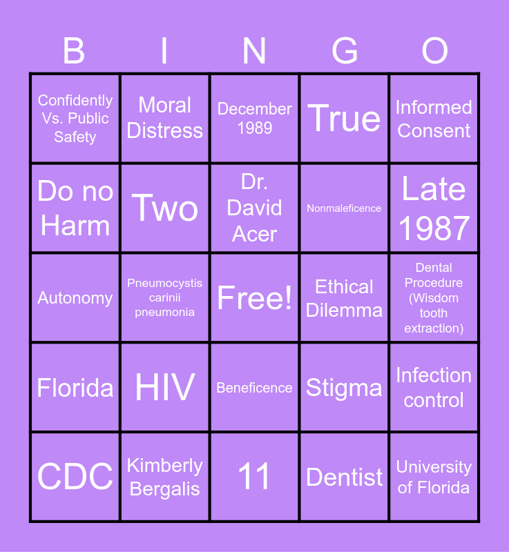 This bingo card has a free space and 24 words: HIV, Kimberly Bergalis, Dr. David Acer, CDC, Informed Consent, Confidently Vs. Public Safety, Do no Harm, Moral Distress, Ethical Dilemma, Beneficence, Nonmaleficence, Autonomy, Stigma, Infection control, Two, Dentist, Dental Procedure (Wisdom tooth extraction), December 1989, Late 1987, Pneumocystis carinii pneumonia, University of Florida, Florida, True and 11.