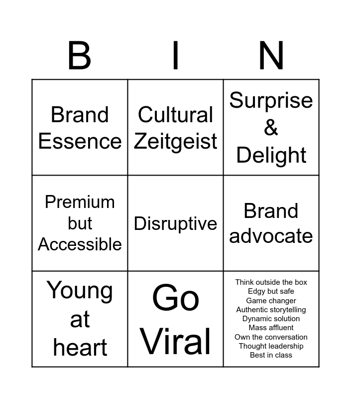 This bingo card has 10 words: Go Viral, Surprise & Delight, Brand Essence, Disruptive, Premium but Accessible, Young at heart, Cultural Zeitgeist, Category leader, Brand advocate and Think outside the box Edgy but safe Game changer Authentic storytelling Dynamic solution Mass affluent Own the conversation Thought leadership Best in class.