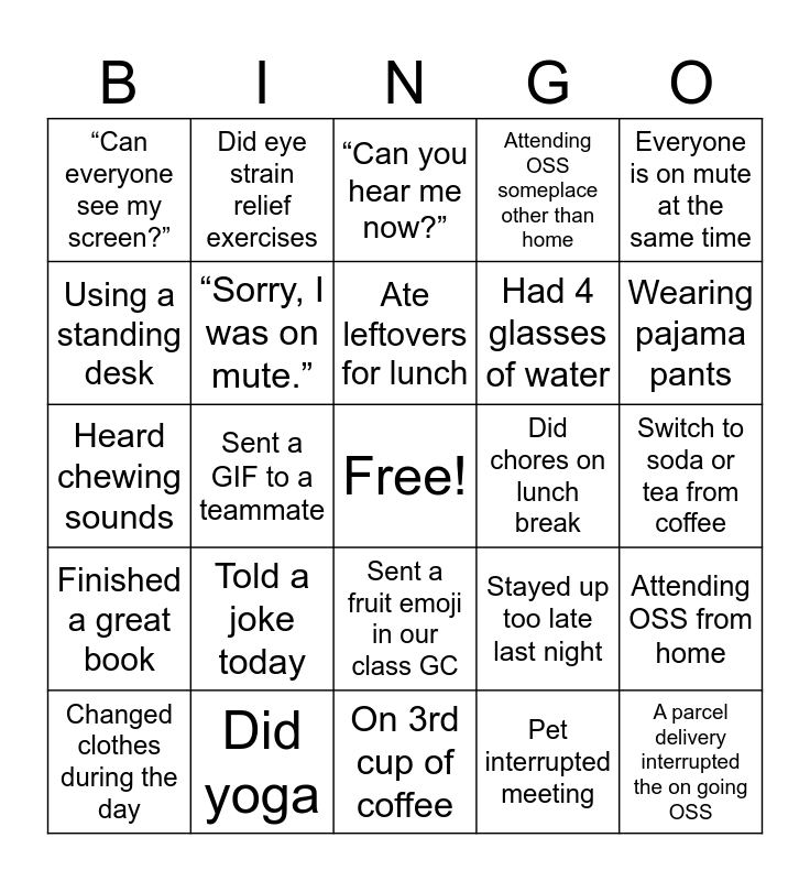 This bingo card has a free space and 30 words: Did yoga, Forgot to brush your teeth this morning, Sent a GIF to a teammate, Made a delicious breakfast, “Can everyone see my screen?”, “Can you hear me now?”, “Sorry, I was on mute.”, Sent a fruit emoji in our class GC, Did chores on lunch break, On 3rd cup of coffee, Switch to soda or tea from coffee, A parcel delivery interrupted the on going OSS, Pet interrupted meeting, A family member interrupted a meeting, Wearing pajama pants, Have a workday playlist, Stayed up too late last night, Finished a great book, Told a joke today, Everyone is on mute at the same time, Heard chewing sounds, Three people spoke at once, Did eye strain relief exercises, Had 4 glasses of water, Using a standing desk, Attending OSS someplace other than home, Attending OSS from home, Changed clothes during the day, Ate leftovers for lunch and Made the bed this morning.