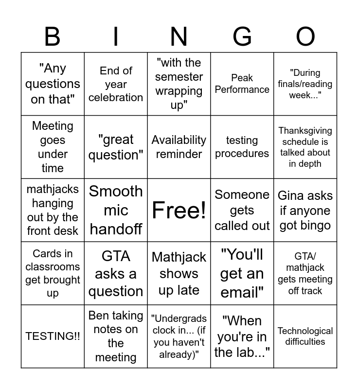 This bingo card has a free space and 25 words: GTA asks a question, "Undergrads clock in... (if you haven't already)", Availability reminder, TESTING!!, "During finals/reading week...", "Any questions on that", Meeting goes under time, End of year celebration, Someone gets called out, Mathjack shows up late, testing procedures, mathjacks hanging out by the front desk, "You'll get an email", GTA/ mathjack gets meeting off track, "great question", "while we're all here", Gina asks if anyone got bingo, "with the semester wrapping up", Thanksgiving schedule is talked about in depth, Smooth mic handoff, Technological difficulties, Ben taking notes on the meeting, Cards in classrooms get brought up, Peak Performance and "When you're in the lab...".