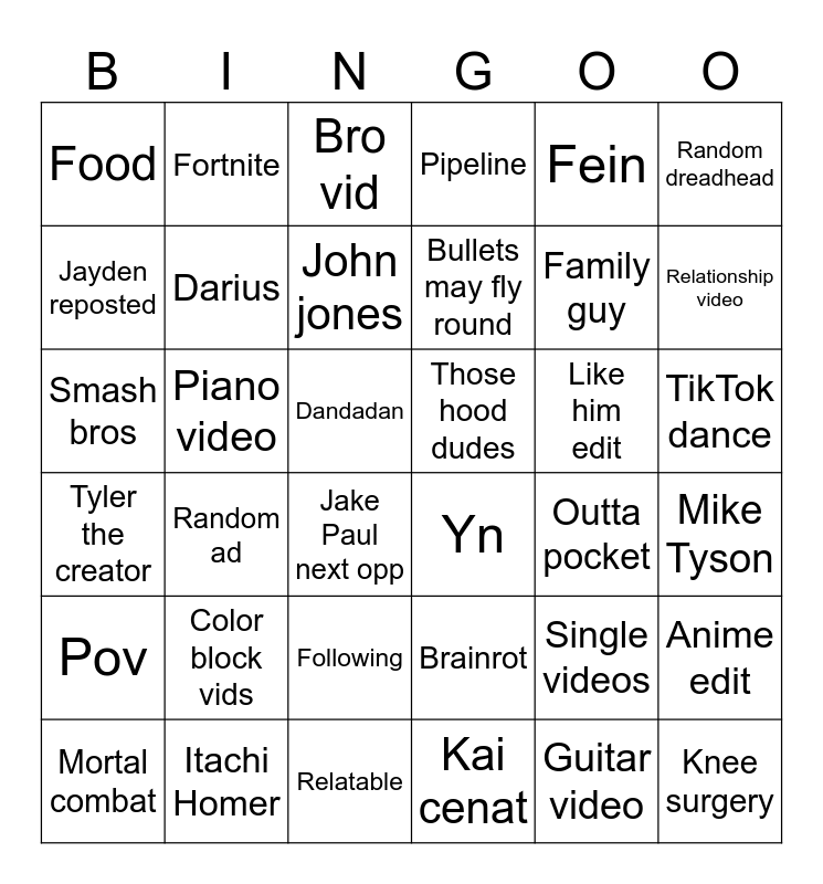 This bingo card has 36 words: Tyler the creator, Random ad, Relatable, Bullets may fly round, Like him edit, TikTok dance, Food, Itachi Homer, Bro vid, Brainrot, Family guy, Random dreadhead, Pov, Piano video, John jones, Pipeline, Single videos, Mike Tyson, Jayden reposted, Darius, Jake Paul next opp, Yn, Outta pocket, Anime edit, Smash bros, Fortnite, Dandadan, Kai cenat, Fein, Relationship video, Mortal combat, Color block vids, Following, Those hood dudes, Guitar video and Knee surgery.
