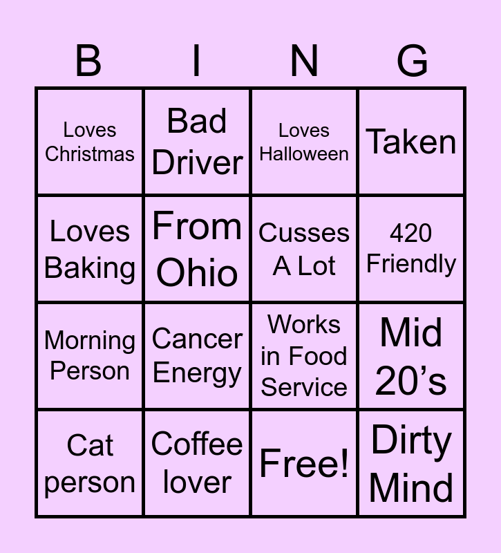 This bingo card has 16 words: Cat person, Coffee lover, Loves Halloween, Taken, Loves Baking, Bad Driver, Works in Food Service, Mid 20’s, Loves Christmas, From Ohio, Free!, 420 Friendly, Morning Person, Cancer Energy, Cusses A Lot and Dirty Mind.