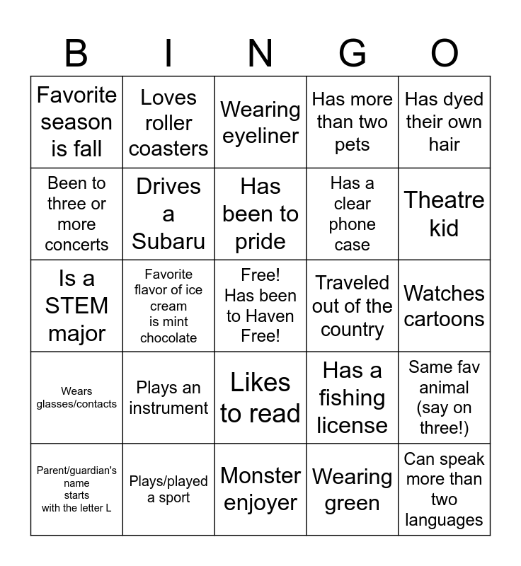 This bingo card has 40 words: Wearing patterned socks, Is a STEM major, Has a piercing, Drives a Subaru, Plays/played a sport, Likes to read, Has been to pride, Is an only child, Has dyed their own hair, Wears glasses/contacts, Favorite flavor of ice cream is mint chocolate, Has more than two pets, Free! Has been to Haven Free!, Watches cartoons, Traveled out of the country, Plays an instrument, Dislikes caffeine, Favorite season is fall, Is an Art Major, Wearing eyeliner, Same fav animal (say on three!), Wearing green, Has a clear phone case, Been to three or more concerts, Has a tattoo, Owns Crocs, Has blue eyes, Has taken a dance class, Can speak more than two languages, Knows someone with a dalmatian, Has band merch, Parent/guardian's name starts with the letter L, Met with their advisor for registration, Has a fishing license, Theatre kid, Monster enjoyer, Picks up worms, Sews/Crochets/Knits, Loves roller coasters and From out of state.