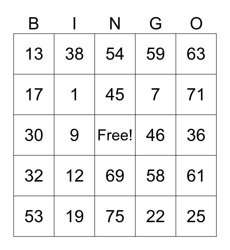 This bingo card has a free space and 24 words: 12, 19, 45, 53, 63, 13, 17, 38, 46, 69, 7, 30, 58, 61, 1, 22, 36, 54, 71, 9, 25, 32, 59 and 75.