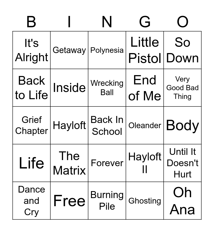 This bingo card has 25 words: The Matrix, Burning Pile, Wrecking Ball, Dance and Cry, So Down, It's Alright, Back to Life, Getaway, Oleander, Forever, End of Me, Grief Chapter, Hayloft II, Until It Doesn't Hurt, Inside, Oh Ana, Body, Polynesia, Very Good Bad Thing, Hayloft, Back In School, Free, Life, Little Pistol and Ghosting.