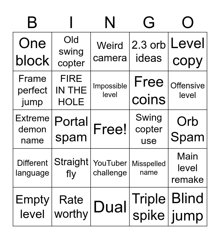 This bingo card has a free space and 24 words: Straight fly, Rate worthy, Impossible level, Empty level, Level copy, One block, Frame perfect jump, Old swing copter, Swing copter use, YouTuber challenge, Free coins, Extreme demon name, Misspelled name, Main level remake, FIRE IN THE HOLE, Triple spike, Orb Spam, Weird camera, Offensive level, Portal spam, Blind jump, Different language, 2.3 orb ideas and Dual.
