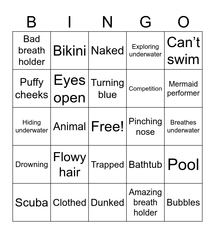 This bingo card has a free space and 24 words: Flowy hair, Clothed, Turning blue, Scuba, Can’t swim, Bad breath holder, Puffy cheeks, Bikini, Pinching nose, Trapped, Competition, Hiding underwater, Bathtub, Pool, Eyes open, Amazing breath holder, Breathes underwater, Naked, Mermaid performer, Animal, Bubbles, Drowning, Exploring underwater and Dunked.