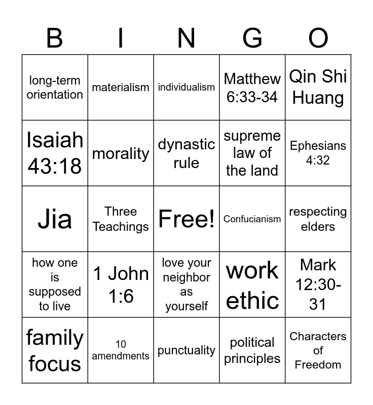 This bingo card has a free space and 29 words: family focus, Buddhism, Three Teachings, Taoism, long-term orientation, individualism, morality, 1 John 1:6, Confucianism, 10 amendments, respecting elders, Characters of Freedom, punctuality, political principles, Ephesians 4:32, moral principles, love your neighbor as yourself, how one is supposed to live, Qin Shi Huang, Jia, work ethic, forgive one another as we have been forgiven, supreme law of the land, Isaiah 43:18, Matthew 6:33-34, materialism, Mark 12:30-31, dynastic rule and short-term orientation.