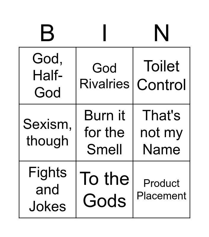 This bingo card has a free space and 8 words: That's not my Name, Toilet Control, God Rivalries, Fights and Jokes, God, Half- God, Product Placement, Sexism, though and To the Gods.