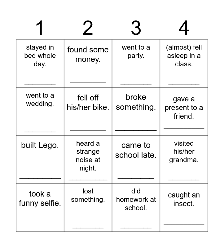 This bingo card has 16 words: lost something. ________, visited his/her grandma. ________, went to a party. ________, stayed in bed whole day. ________, built Lego. _________, found some money. ________, came to school late. ________, did homework at school. ________, went to a wedding. ________, fell off his/her bike. ________, took a funny selfie. ________, (almost) fell asleep in a class. ________, heard a strange noise at night. __________, gave a present to a friend. __________, broke something. _________ and caught an insect. __________.