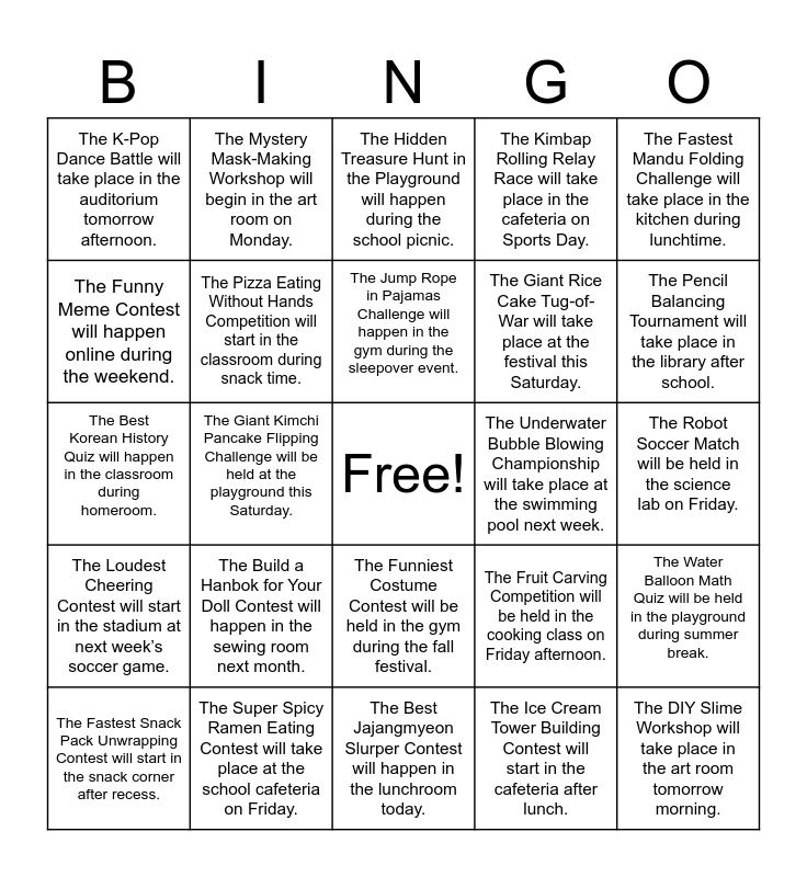 This bingo card has a free space and 30 words: The Super Spicy Ramen Eating Contest will take place at the school cafeteria on Friday., The Backwards Running Race will happen in the soccer field after lunch., The Giant Kimchi Pancake Flipping Challenge will be held at the playground this Saturday., The All-Day Gaming Marathon will happen in the computer room next Sunday., The K-Pop Dance Battle will take place in the auditorium tomorrow afternoon., The Hidden Treasure Hunt in the Playground will happen during the school picnic., The Pizza Eating Without Hands Competition will start in the classroom during snack time., The Funniest Costume Contest will be held in the gym during the fall festival., The Underwater Bubble Blowing Championship will take place at the swimming pool next week., The Best Jajangmyeon Slurper Contest will happen in the lunchroom today., The Robot Soccer Match will be held in the science lab on Friday., The DIY Slime Workshop will take place in the art room tomorrow morning., The Ice Cream Tower Building Contest will start in the cafeteria after lunch., The World’s Slowest Bicycle Race will happen in the parking lot this weekend., The Pencil Balancing Tournament will take place in the library after school., The Silliest Hula Hoop Dance will begin on the playground during recess., The Fruit Carving Competition will be held in the cooking class on Friday afternoon., The Loudest Cheering Contest will start in the stadium at next week’s soccer game., The Build a Hanbok for Your Doll Contest will happen in the sewing room next month., The Fastest Mandu Folding Challenge will take place in the kitchen during lunchtime., The Best Korean History Quiz will happen in the classroom during homeroom., The Classroom Paper Airplane Contest will happen in the hallway after class., The Mystery Mask-Making Workshop will begin in the art room on Monday., The Giant Rice Cake Tug-of-War will take place at the festival this Saturday., The Funny Meme Contest will happen online during the weekend., The Kimbap Rolling Relay Race will take place in the cafeteria on Sports Day., The Water Balloon Math Quiz will be held in the playground during summer break., The Fastest Snack Pack Unwrapping Contest will start in the snack corner after recess., The Jump Rope in Pajamas Challenge will happen in the gym during the sleepover event. and The Biggest Bubble Gum Bubble Contest will be held in the classroom tomorrow morning..