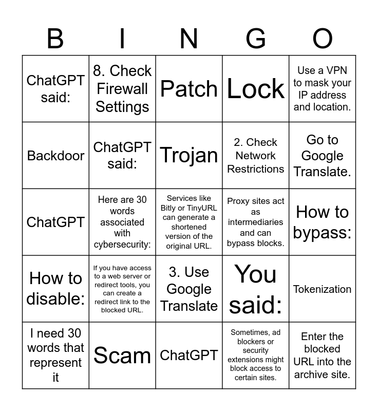 This bingo card has 152 words: Free!, ChatGPT, You said:, How to remove a block on a site, ChatGPT said:, ChatGPT, If you are blocked from accessing a website, it could be due to several reasons, such as restrictions set by your network, browser settings, or the website itself. Here are some steps you can take to remove or bypass a block, depending on the sc, 1. Clear Browser Cache and Cookies, The site may have blocked you based on cookies or cache data., How to do it:, Go to your browser's settings > Privacy > Clear browsing data., Select "Cookies and other site data" and "Cached images and files.", 2. Check Network Restrictions, If the block is on your network (e.g., work, school, or public Wi-Fi), it may be implemented at the router or firewall level., How to bypass:, Use a VPN to mask your IP address and location., Switch to a different network (e.g., mobile data)., 3. Use a Different Browser or Device, Try accessing the site on another browser or device to check if the issue is localized to your current setup., 4. Contact the Website Admin, If the block is imposed by the site (e.g., IP ban), try contacting the website's support team to request unblocking., 5. Use a Proxy Server, Proxy servers can bypass restrictions by routing your traffic through an intermediary server., How to use:, Search for free or paid proxy services online (e.g., HideMyAss, ProxySite)., 6. Disable Browser Extensions, Sometimes, ad blockers or security extensions might block access to certain sites., How to disable:, Open your browser > Extensions or Add-ons > Disable all and try again., 7. Change DNS Settings, Certain DNS servers (e.g., your ISP's) may block access to specific websites., How to change DNS:, Switch to Google DNS (8.8.8.8, 8.8.4.4) or Cloudflare DNS (1.1.1.1)., 8. Check Firewall Settings, If you're using a personal firewall, it might be blocking the site. Temporarily disable it and try again., If none of these methods work, let me know more details (e.g., error messages or the nature of the block) for tailored assistance., You said:, Can i convert a link to another link tgat doesn't have block on it, ChatGPT said:, ChatGPT, Yes, you can use certain methods to "convert" a blocked link into an accessible one, essentially masking the original URL. Here are a few techniques:, 1. Use a URL Shortener, Services like Bitly or TinyURL can generate a shortened version of the original URL., How to do it:, Visit a URL shortener website., Paste the blocked link., Get a new shortened link., 2. Redirect Through a Proxy Site, Proxy sites act as intermediaries and can bypass blocks., How to use:, Visit a proxy site (e.g., hide.me or ProxySite)., Enter the blocked URL to generate a working link., 3. Use Google Translate, Google Translate can act as a bypass by treating the site as a "translation.", How to do it:, Go to Google Translate., Enter the blocked URL in the source field., Translate from one language to another (e.g., English to French)., Click the link in the translated text., 4. Archive Services, Use services like the Wayback Machine or CachedView to access an archived version of the page., How to do it:, Enter the blocked URL into the archive site., Share the archive link instead., 5. Use Custom Redirects, If you have access to a web server or redirect tools, you can create a redirect link to the blocked URL., How to do it:, Create a simple redirect page on a platform like Google Sites or GitHub Pages., Share the new link, which redirects to the original., If you provide more details about the block or the purpose, I can guide you further., You said:, I need a website to generate bingo games, ChatGPT said:, ChatGPT, Searched 5 sites, Here are some websites you can use to create and play bingo games:, My Free Bingo Cards: This site allows you to generate custom printable and virtual bingo cards. You can create cards with specific themes, set grid sizes, and choose between printable and digital options. Great for classrooms or events. Visit her, Bingo Baker: This platform enables you to customize bingo cards with text, numbers, or images. You can play virtually or print cards for in-person games. It also includes a random caller feature for gameplay. Visit here【11】【14】., Bingo Maker: This site offers both virtual and printed cards and includes a bingo caller for game hosting. It's a versatile option for interactive games, allowing you to host players online with personalized settings. Visit here【12】., Bingogo: Another user-friendly platform for bingo games. It supports virtual play and card generation. Visit here【13】., Each of these tools supports unique features, so you can choose one that best suits your needs, whether for teaching, events, or entertainment., You said:, 30 words simple about cyber security, ChatGPT said:, ChatGPT, Cybersecurity protects systems, networks, and data from cyber threats. It involves encryption, firewalls, antivirus software, and secure practices to defend against hacking, malware, and unauthorized access., You said:, I need 30 words that represent it, ChatGPT said:, ChatGPT, Here are 30 words associated with cybersecurity:, Encryption, Firewall, Malware, Phishing, Spyware, Ransomware, Hacking, Authentication, Antivirus, Data breach, Privacy, Threat, Network, Trojan, Worm, Cybercrime, Identity theft, Vulnerability, Security, Penetration, Patch, Tokenization, Two-factor, SSL, DDoS, Intrusion, Backdoor, Botnet, Exploit, Monitoring, These terms broadly cover the components, threats, and defenses in cybersecurity., You said:, Make them for gradev2 level English, ChatGPT said:, ChatGPT, Here are 30 simple words related to cybersecurity, tailored for younger learners or Grade 2 English levels:, Safe, Protect, Computer, Internet, Password, Code, Virus, Hack, Block, Spy, Scam, Secret, Lock, Data, Fake, Safe, File, Trust, Alert, Danger, Email, Click, Check, Stop and Share.