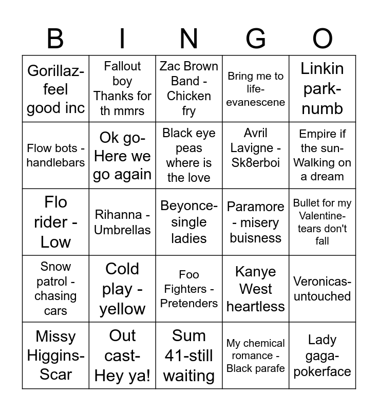 This bingo card has 25 words: Cold play - yellow, Sum 41-still waiting, Black eye peas where is the love, Missy Higgins-Scar, Linkin park-numb, Gorillaz-feel good inc, Flow bots - handlebars, Fallout boy Thanks for th mmrs, Paramore - misery buisness, Foo Fighters - Pretenders, Avril Lavigne - Sk8erboi, Flo rider - Low, Kanye West heartless, Veronicas-untouched, Ok go- Here we go again, Lady gaga-pokerface, Bullet for my Valentine- tears don't fall, Zac Brown Band - Chicken fry, Empire if the sun- Walking on a dream, Rihanna -Umbrellas, Beyonce- single ladies, Out cast- Hey ya!, Snow patrol -chasing cars, Bring me to life-evanescene and My chemical romance -Black parafe.