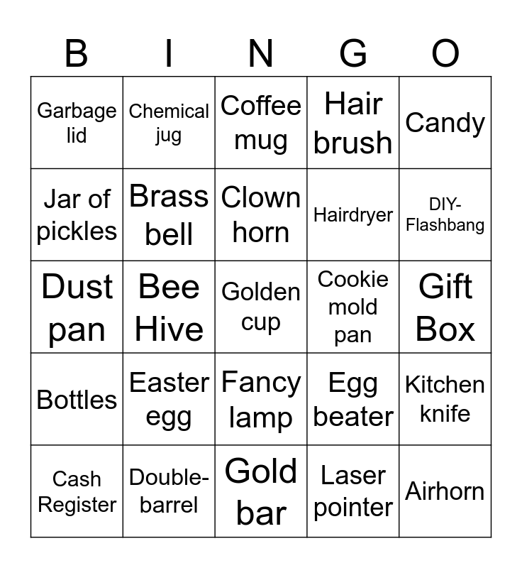 This bingo card has 33 words: Airhorn, Apparatus, Bee Hive, Big Bolt, Bottles, Brass bell, Candy, Cash Register, Chemical jug, Clock, Clown horn, Coffee mug, Comedy, Control pad, Cookie mold pan, DIY-Flashbang, Double-barrel, Dust pan, Easter egg, Egg beater, Fancy lamp, Flask, Garbage lid, Gift Box, Gold bar, Golden cup, Hair brush, Hairdryer, Jar of pickles, Kitchen knife, Large axle, Laser pointer and Magic 7 ball.
