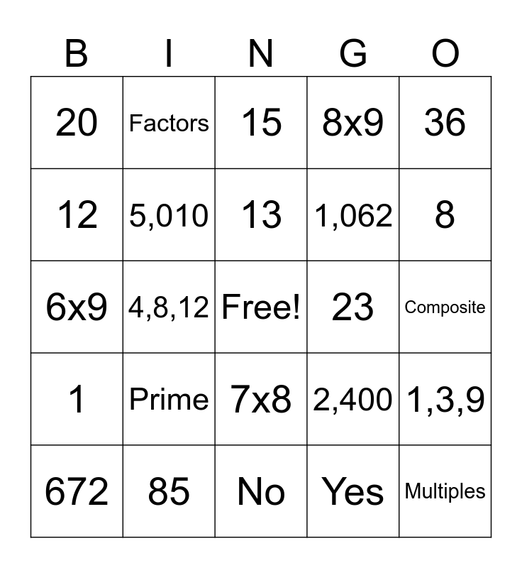 This bingo card has a free space and 24 words: Prime, 85, 13, 672, 36, 20, 12, Factors, 23, 7x8, 1,062, 6x9, 2,400, 1,3,9, 5,010, Yes, Composite, 15, 8, 4,8,12, Multiples, 1, 8x9 and No.