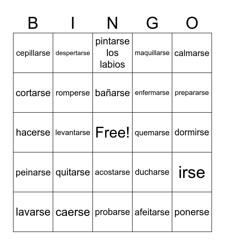This bingo card has a free space and 26 words: acostarse, afeitarse, bañarse, caerse, calmarse, cepillarse, cortarse, despertarse, dormirse, ducharse, enfermarse, hacerse, irse, lavarse, levantarse, llamarse, maquillarse, peinarse, pintarse los labios, ponerse, prepararse, probarse, quemarse, quitarse, romperse and vestirse.