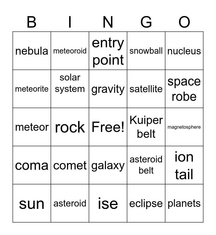 This bingo card has a free space and 24 words: comet, asteroid, gravity, sun, nucleus, nebula, meteorite, meteoroid, Kuiper belt, galaxy, satellite, meteor, asteroid belt, ion tail, solar system, eclipse, magnetosphere, entry point, space robe, rock, planets, coma, snowball and ise.