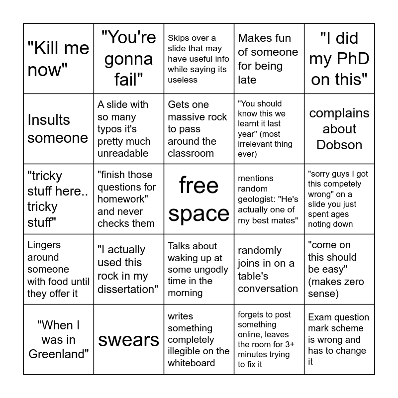 This bingo card has a free space and 24 words: "I actually used this rock in my dissertation", swears, Gets one massive rock to pass around the classroom, "When I was in Greenland", "I did my PhD on this", "Kill me now", Insults someone, "You're gonna fail", mentions random geologist: "He's actually one of my best mates", Talks about waking up at some ungodly time in the morning, "You should know this we learnt it last year" (most irrelevant thing ever), "tricky stuff here.. tricky stuff", randomly joins in on a table's conversation, "come on this should be easy" (makes zero sense), A slide with so many typos it's pretty much unreadable, forgets to post something online, leaves the room for 3+ minutes trying to fix it, "sorry guys I got this competely wrong" on a slide you just spent ages noting down, Skips over a slide that may have useful info while saying its useless, complains about Dobson, "finish those questions for homework" and never checks them, Exam question mark scheme is wrong and has to change it, Lingers around someone with food until they offer it, Makes fun of someone for being late and writes something completely illegible on the whiteboard.