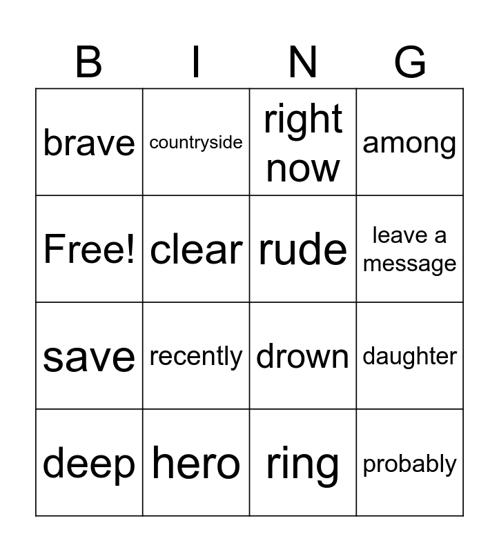 This bingo card has 16 words: hero, daughter, right now, brave, save, countryside, drown, ring, Free!, clear, deep, among, recently, leave a message, rude and probably.